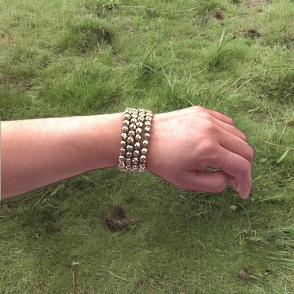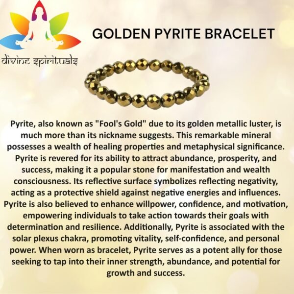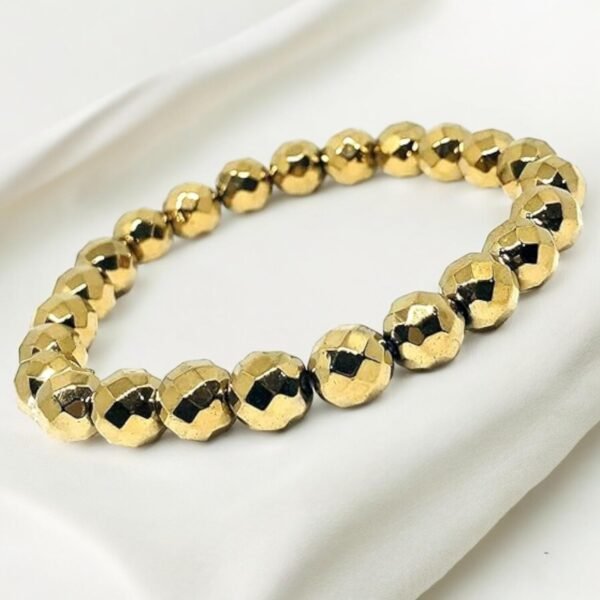 This AAA Grade Diamond-cut Golden Pyrite Bracelet has mesmerizing allure, combining the radiant elegance of diamond-like facets with the warm, lustrous hue of golden pyrite. Each facet reflects light in dazzling patterns, evoking a sense of luxury and sophistication. The intricate craftsmanship and natural formations within the pyrite create a unique piece of jewelry, making it a stunning accessory that elevates any ensemble., Pyrite is often called a stone of abundance and manifestation due to its association with prosperity and wealth. Its golden color and reflective surface symbolize abundance and the potential for attracting wealth and prosperity into one’s life. Pyrite encourages individuals to set clear intentions, take action towards their goals, and manifest their desires with confidence and determination., Pyrite possesses protective energies that shield individuals from negative influences and energies. Its reflective surface acts as a protective barrier, deflecting negative energies. Pyrite’s protective aura promotes a sense of safety, security, and empowerment. It also helps dispel feelings of fear, anxiety, and insecurity, fostering inner strength and resilience., Bask in the radiant energy of Golden Pyrite with this dazzling gemstone bracelet, with its metallic luster and golden hues, symbolizing abundance, prosperity, and confidence. Adorn yourself with Golden Pyrite to attract wealth and success into your life, while also enhancing your inner strength and determination. Let the shimmering beauty of Golden Pyrite inspire you to pursue your goals with unwavering resolve and optimism., An excellent selection for birthdays, Valentine’s Day, and other significant occasions, this gift emanates positivity and sophistication, evoking joy in your loved ones. Its divine essence and captivating allure make it truly extraordinary, destined to hold a special place in the heart. With enduring durability and its adaptability providing comfortable everyday wear and elegant charm for casual settings, it remains a timeless symbol of affection and style.