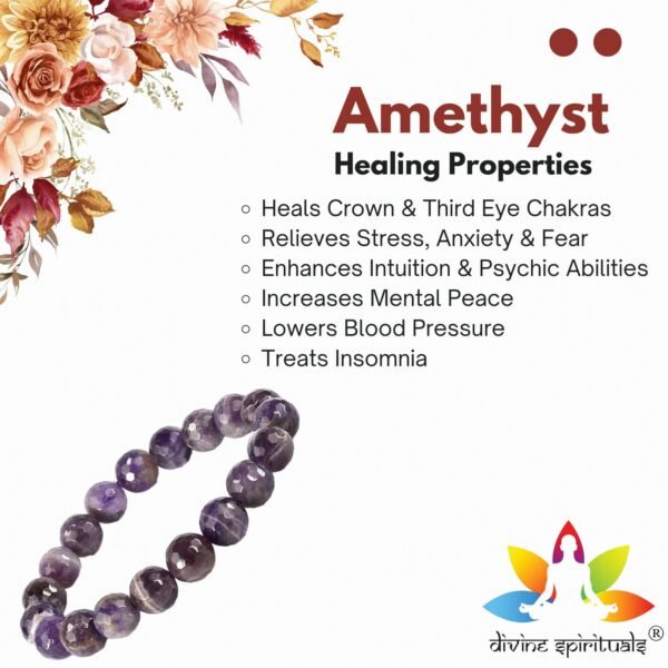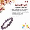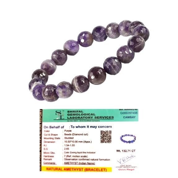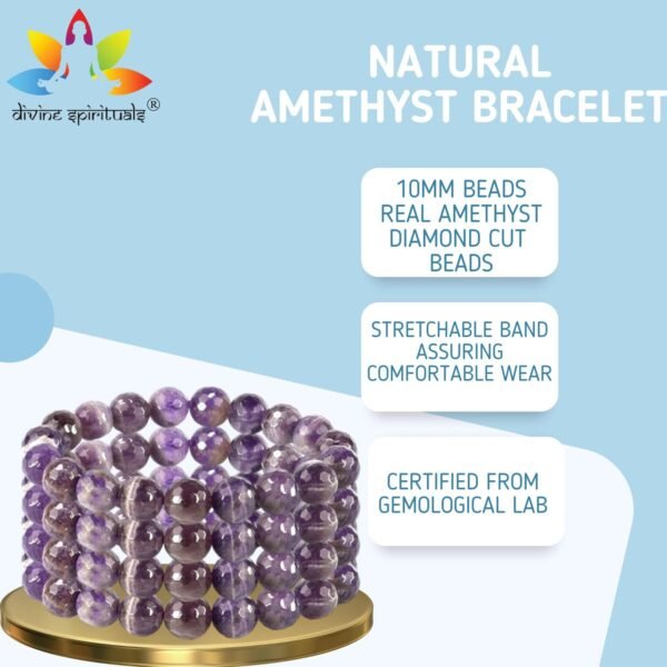 AAA Grade Amethyst Bracelet is made from Natural Amethyst beads sourced from authentic sources such as Brazil. This high-quality bracelet is certified from a reputed gemological lab assuring authenticity of the real crystal., This Bracelet has rich, vibrant purple hues with good saturation. A clean, transparent appearance enhances overall beauty of the jewel. Precision in cutting enhances the brilliance and sparkle of the amethyst. Well-cut stones have symmetrical facets and proper proportions with minimal inclusions., Amethyst is known for its calming & purifying qualities, promoting emotional balance and stress relief. Believed to enhance spiritual awareness,aids in meditation and clarity of thought. Its soothing energy promotes overall well-being. Helps in meditation of third eye and crown chakra., This eminent quality of amethyst bracelet lies in its capacity to amplify intuitive abilities and spiritual insight, revered for enhancing clarity of thought, deepening meditation experiences, and facilitating a connection to higher realms of consciousness., Wearing an amethyst bracelet combines its inherent qualities of promoting harmonious balance and intuitive wisdom with a healing effect that brings about enhanced calmness, stress relief, and mental clarity. It becomes a true companion for meditation & manifestation , creates a holistic experience, fostering emotional well-being and a deeper connection to one’s inner self.