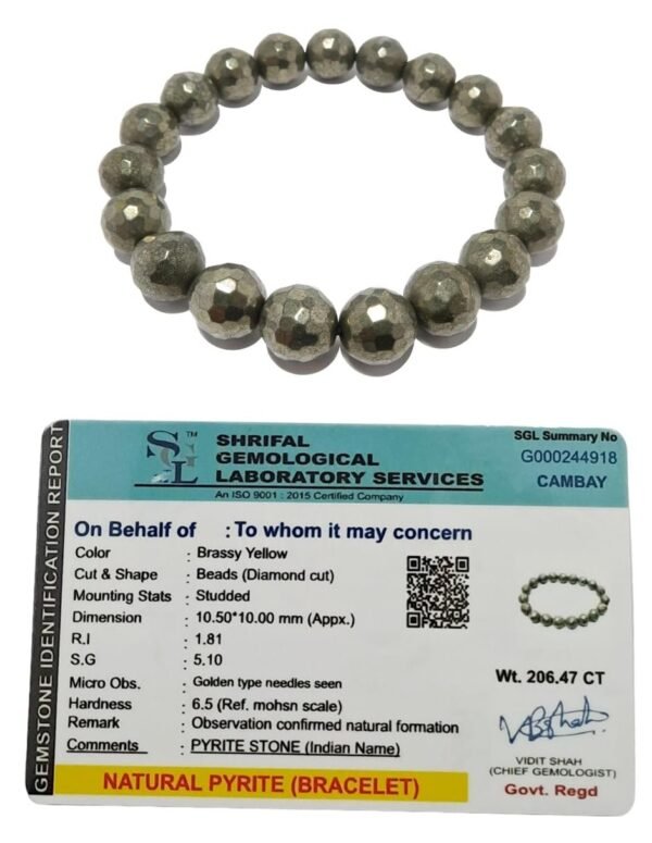 Pyrite 10 mm Diamond Cut Strechable Band Original Certified Bracelet – Stone of ? Attract Wealth ? Business Luck ? Boost stamina ? Abundance ? Prosperity ? Strengthens your Willpower ? Mental stability ? Creativity ? Learning and Perception ? Intelligence ? Logic ? Psychic development ? Memory ? Optimism ? Channeling abilities ? Practicality ? Protection ? Meditation ? Health ? Well ? Being ? Changing Bad Habits ? Confidence ? Empowerment ? Focus ? Grounding ? Vitality, Natural Pyrite Golden Beads Bracelet ? Money Magnet, Attract Wealth Prosperity Good Luck [Excellent Results] This crystal is for money and abundance. Pyrite attracts money, it?s known to be a money magnet. According to Crystal healing, having this crystal with you attracts wealth and fame., 100% Original & Natural Pyrite Bracelet [ Export Quality ] Made up of High-Quality Adjustable Thread and band options ? It?s one size fits all. Pyrite found its name from the Greek word pyr, which means ?fire?, the French call it Pierre de Sante, meaning ?stone of health? as they say it positively affects the body?s health. PRODUCT DETAILS Item Type: Bracelet Material: Pyrite Stone Bead Size: 8mm Size: Adjustable Gender: Unisex, Pyrite is one of the best stones to attract business and career opportunities. Pyrite encourages leadership qualities. Pyrite will help you achieve your dreams. Pyrite inspires leadership qualities., Pyrite beads bracelet is known as a money magnet and brings success in your life. Pyrite gives your physical strength and motivation in your life. it is a good stone for those related to the property business.Gifiting Pyrite Stone is a perfect gift for someone special, starting a new business and job, student, businessman. it should be kept by every person who works in the office.